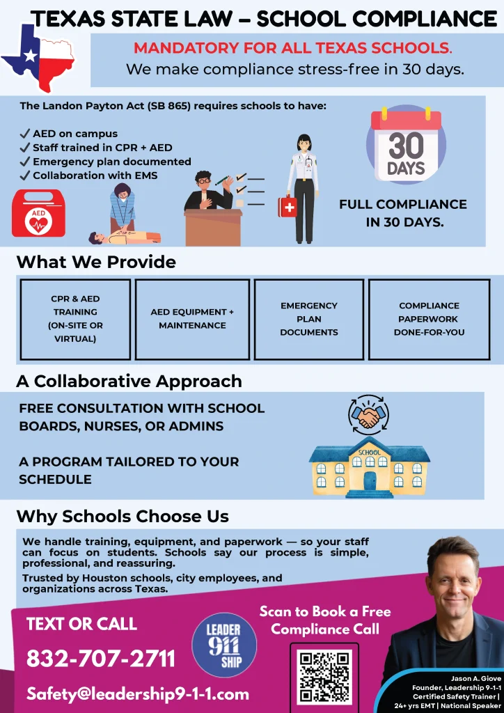 Leadership 9-1-1 offers a variety of safety courses and lifesaving classes in Texas with the aim of meeting the unique needs of businesses, schools, organizations, and families.